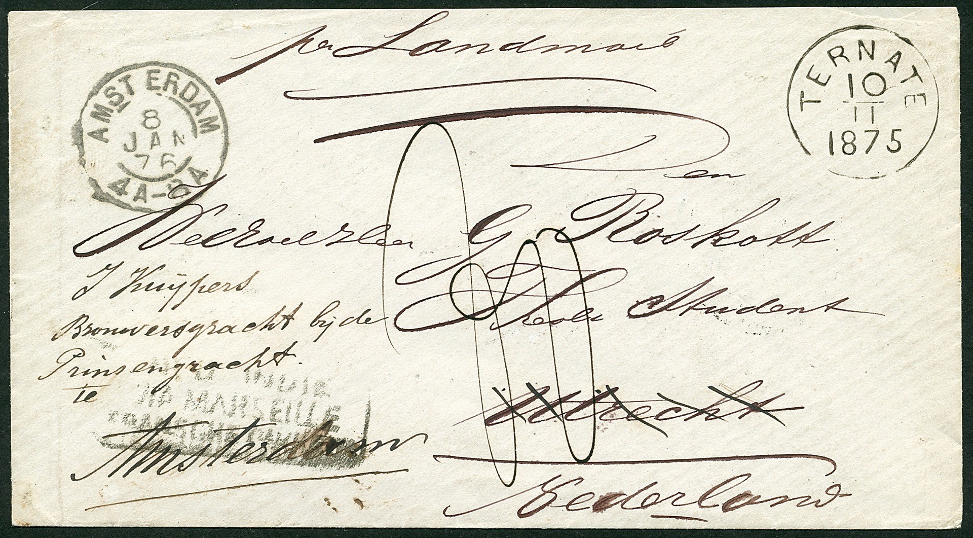 Couvert van Ternate 10-11-1875 (sublieme afdruk rondstempel in zwart) ongefr. verz. via Marseille naar een student te Utrecht 7-1-1876, op az. ovaalstempel ´Afgeschreven/Utrecht´ (daar kon het port van 80 cent niet worden geïnd), doorgez. naar Amsterdam 8-1. Schaarse herkomst, schaars tarief. Zie: NITAR.124