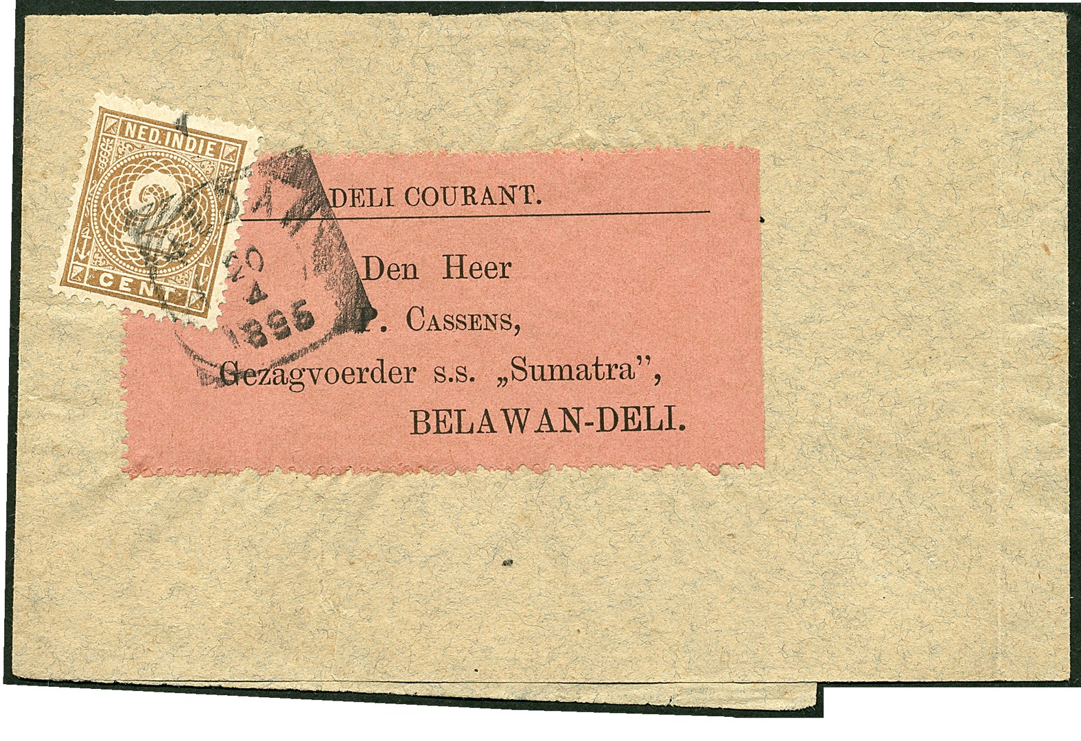 Cijferzegels. Drukwerkbandjes gefr. met 2c van Medan 20-4-1895 naar Belawan, van 2½c (fraai) van Medan 17-8-1906 naar Amsterdam 15-9 en drukwerkcouvertje (az. klep ontbr.) met 1c en 2c in paar van Palembang 29-12-1895 naar Londen 3-2-1896