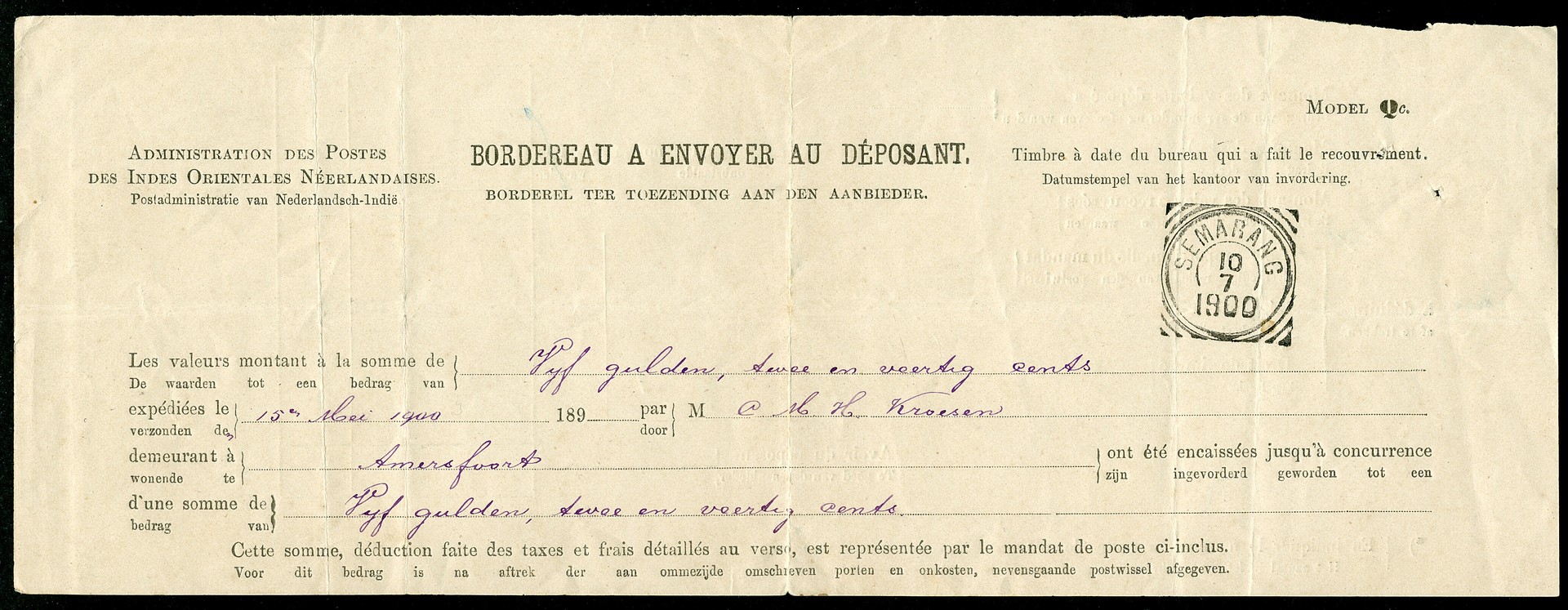 Formulier Model Qc, waarop het bedrag van fl. 5,42 staat geschreven dat een afzender te Amersfoort via de postdienst tevergeefs heeft getracht bij een schuldenaar te Semarang 10-7-1900 in te vorderen. Dit formulier is daarna in een envelop Model Qd naar Amersfoort teruggezonden. Zie: NITAR p. 255. Zeer zeldzaam formulier!