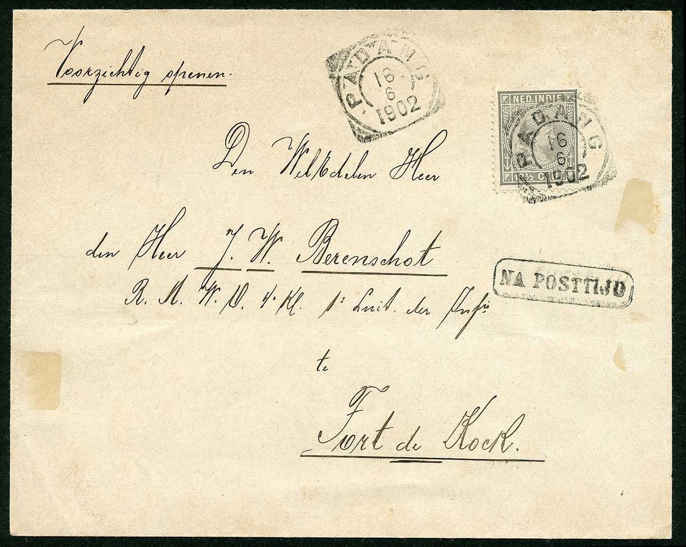 Twee env. gefr. met 12½c Hangend Haar van Padang 15-5-1902 (2 zegels van 12½c) resp. 16-6-1902 (1 zegel) naar J.W. Berenschot, R.M.W.O. der 4e klasse, te Fort de Kock