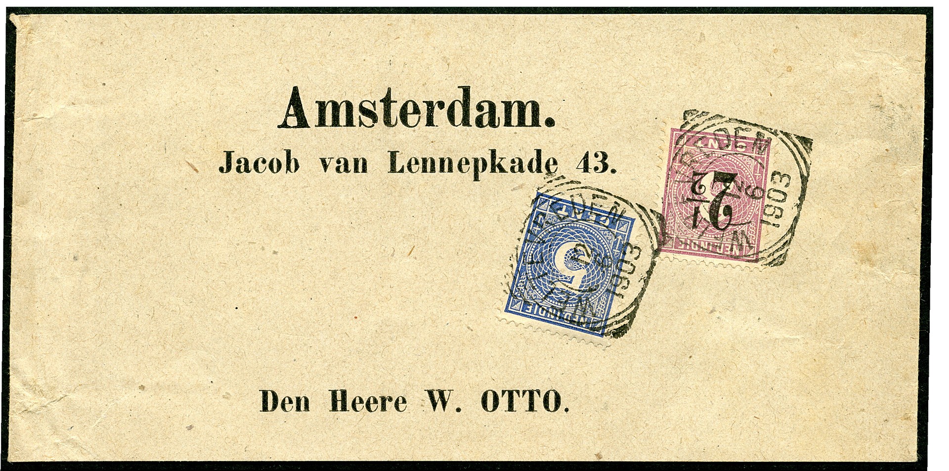Omslagbandje gefr. met nrs. 22 en 39 van Weltevreden 12-6-1903 naar Amsterdam. Bandjes uit Indië zijn schaars!