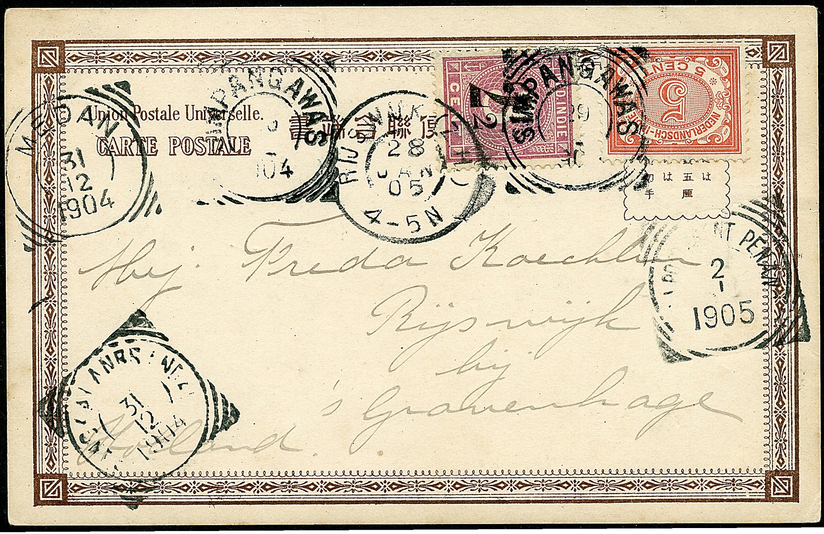 Vierkant SIMPANGAWAS op prentbk. gefr. met 2½c en 5c van 29-12-1904 via Pangkalanbrandan, Medan en de N.I.Postagent Penang 2-1-1905 naar Rijswijk (ZH) 28-1 (SvL R)