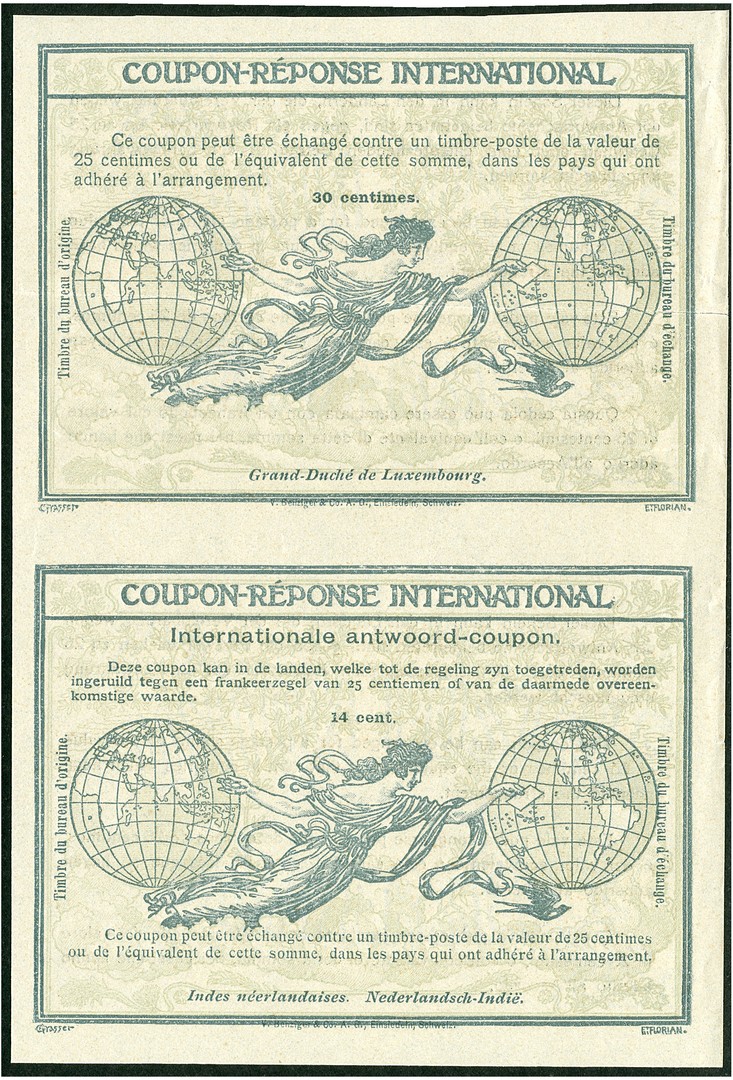 IAC, Model Rome, 14 cent als G1 maar type II (az. zonder strepen tussen de vier talen), in Indië niet uitgegeven, in verticale samenhang met Luxemburg (dit ex. deels met kreukjes en ingeknipt). Afkomstig uit UPU-archieven en zeer zeldzaam, wellicht uniek!
