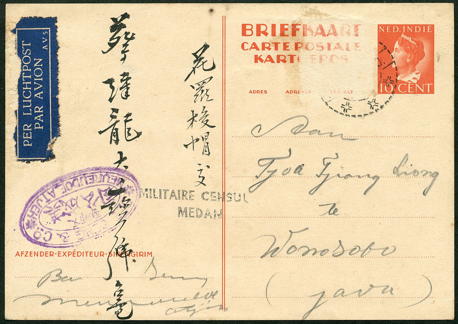 De zo gezochte echt gebruikte Van Konijnenburg-briefkaart, maar waarvan helaas een zegel van 7½ cent voor het luchtrecht is verwijderd, van Meureudoe over Medan (militaire censuur) naar Wonosobo