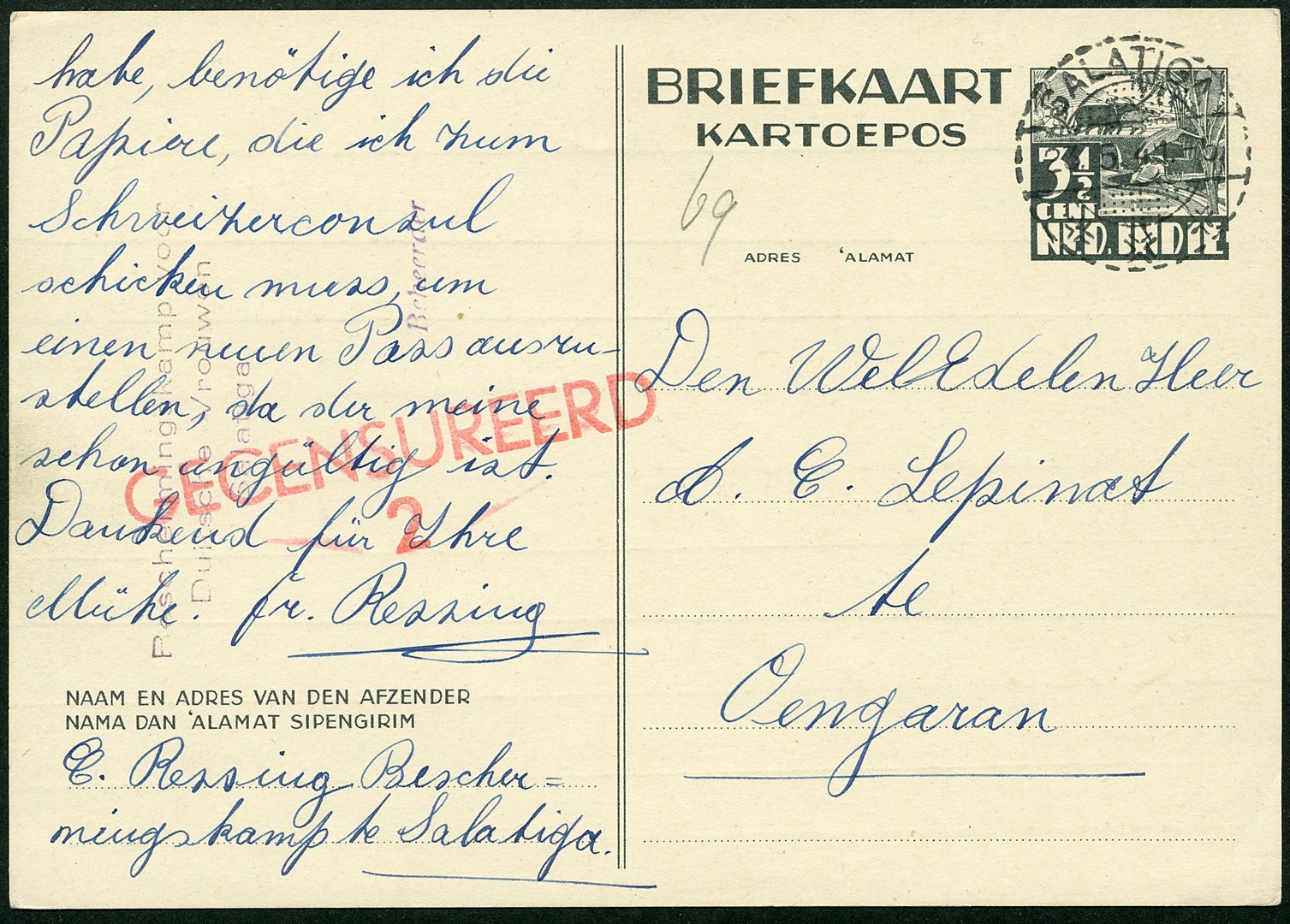 Interneringskampen. Vierregelig stempel 'Beschermingskamp voor/Duitsche Vrouwen/Salatiga/Beheerder' (deW. type KB D L) in violet op bk. van Salatiga 23-5-1941 (PV2) naar Oengaran. Zeldzaam!