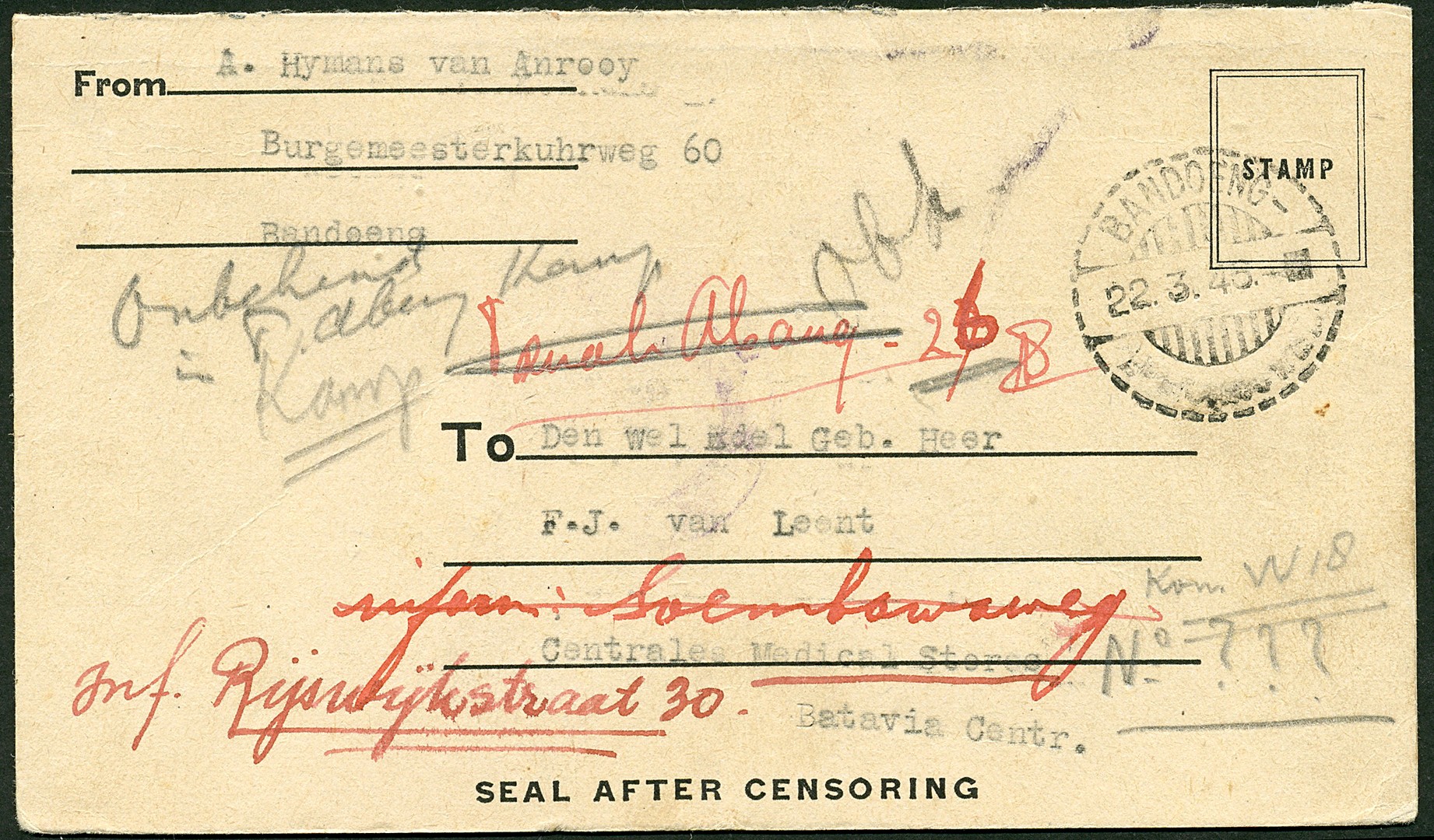 Geallieerd kartonnen postblad van Bandoeng 22-3-1946 (in stempel is Lembangweg weggebeiteld) tevergeefs op zoek naar geadresseerde in Batavia met op az. violet Batavia-C. 24-3-1946