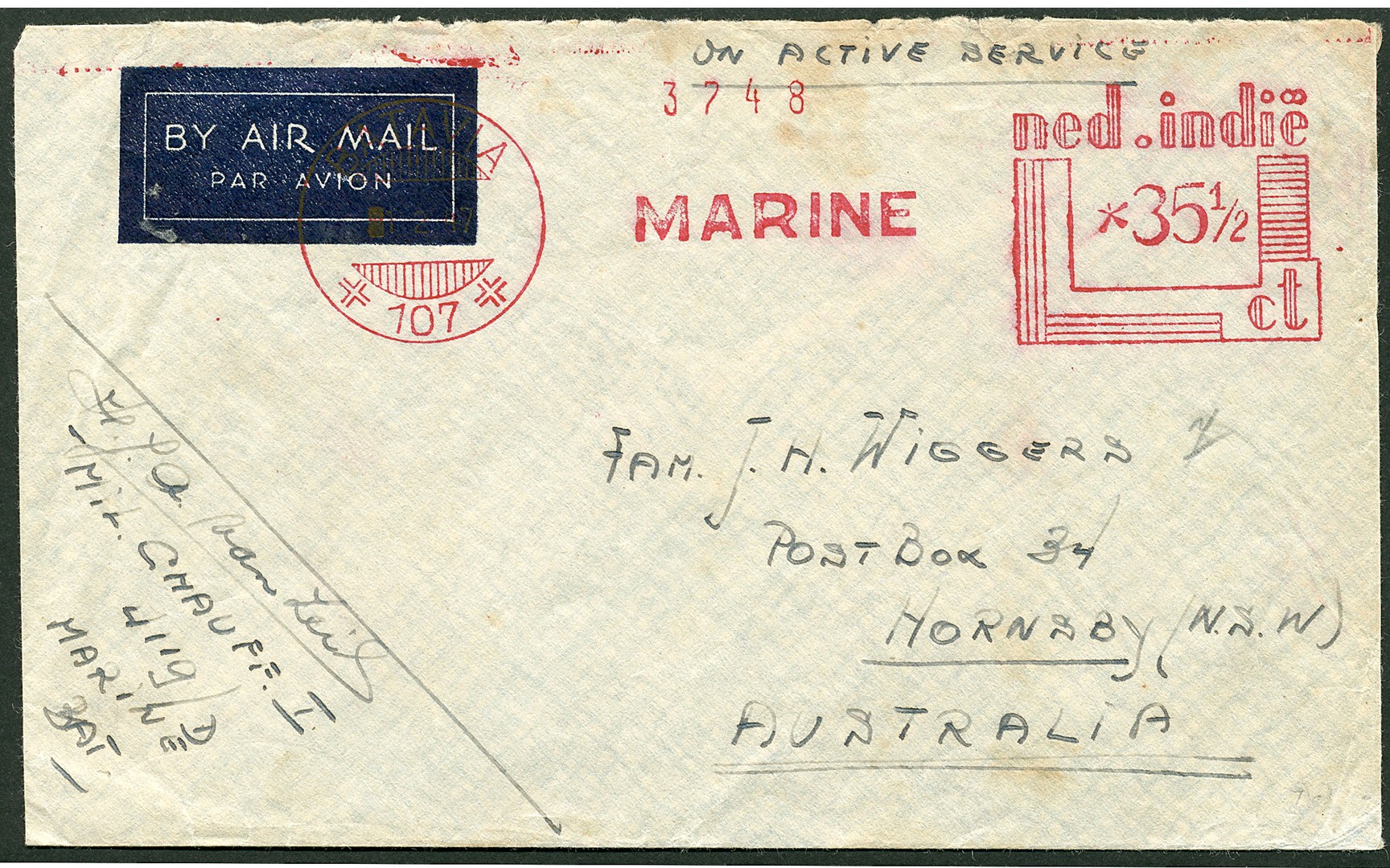Luchtpostenv. met roodfrankering 35½ct van de Marine te Batavia op 1-2-1947 naar Australië. Een bijgevoegde notitie geeft aan dat dit stuk meegevlogen is met de Marine Catalina vliegboot P202-POB die tijdens een tussenlanding te Balikpapan in brand is geraakt, waarbij enige post ongeschonden bleef en met vertraging is bezorgd