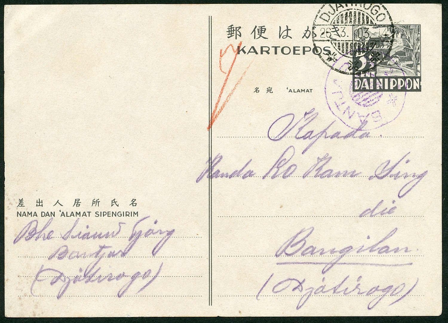 Java. BANTJAR delivery house pmk in violet on censored 3½c postcard Bu.3a via Djatirogo 26.3.03 to Bangilan (vNV.071, RR)