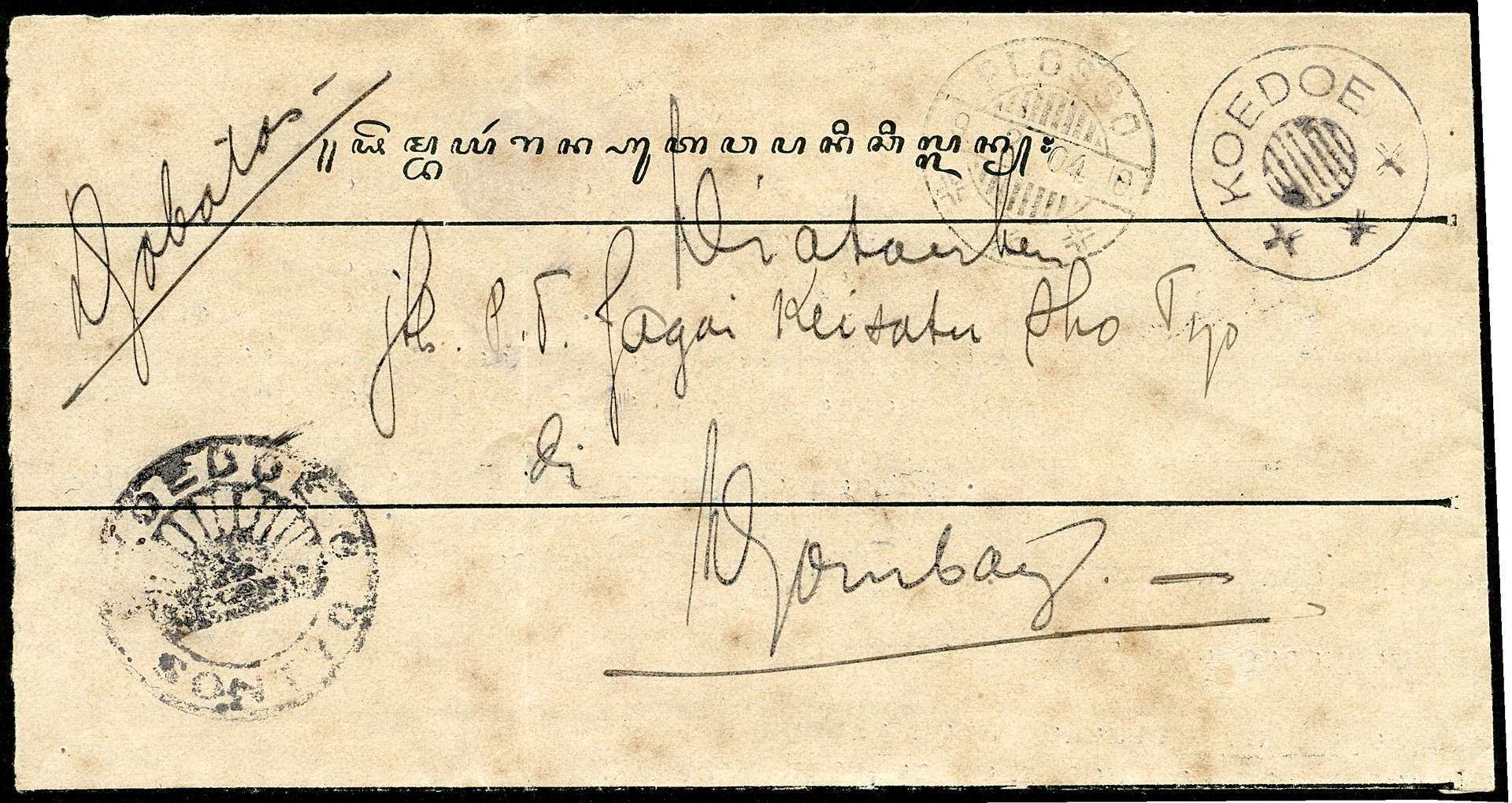 Java. KOEDOE delivery house pmk in black on hand-made official cover via Plosso 9.2.04 to Djombang. Superb strike of the Koedoe pmk (vNV.071, RR)