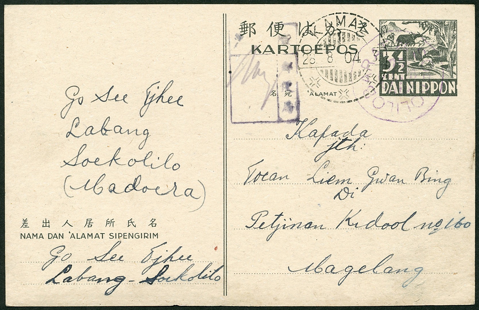 Madoera. SOEKOLILOBARAT delivery house pmk in violet on censored 3½s postcard Bu.J11 via Kamal 28.8.04 to Magelang. Only a few delivery houses are known from Madoera (vNV.071, RR)