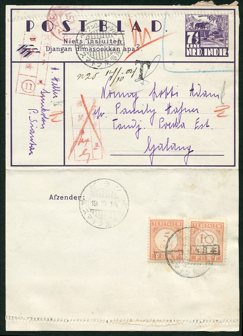 Sumatra. East Coast. Letter sheet without overprint Bu.S4 from Pematangsiantar 19.10.3 declared invalid and taxed with twice 7½c made of postage dues of 5c and 10c with Dai Ni Hon overprints 821z, cancelled at Galang 19.10.14. Censored at Medan with sewing machine and Bu.JC15, 17. Pre-war occupation stamps and postal stationery were declared invaled as of Oct 1944