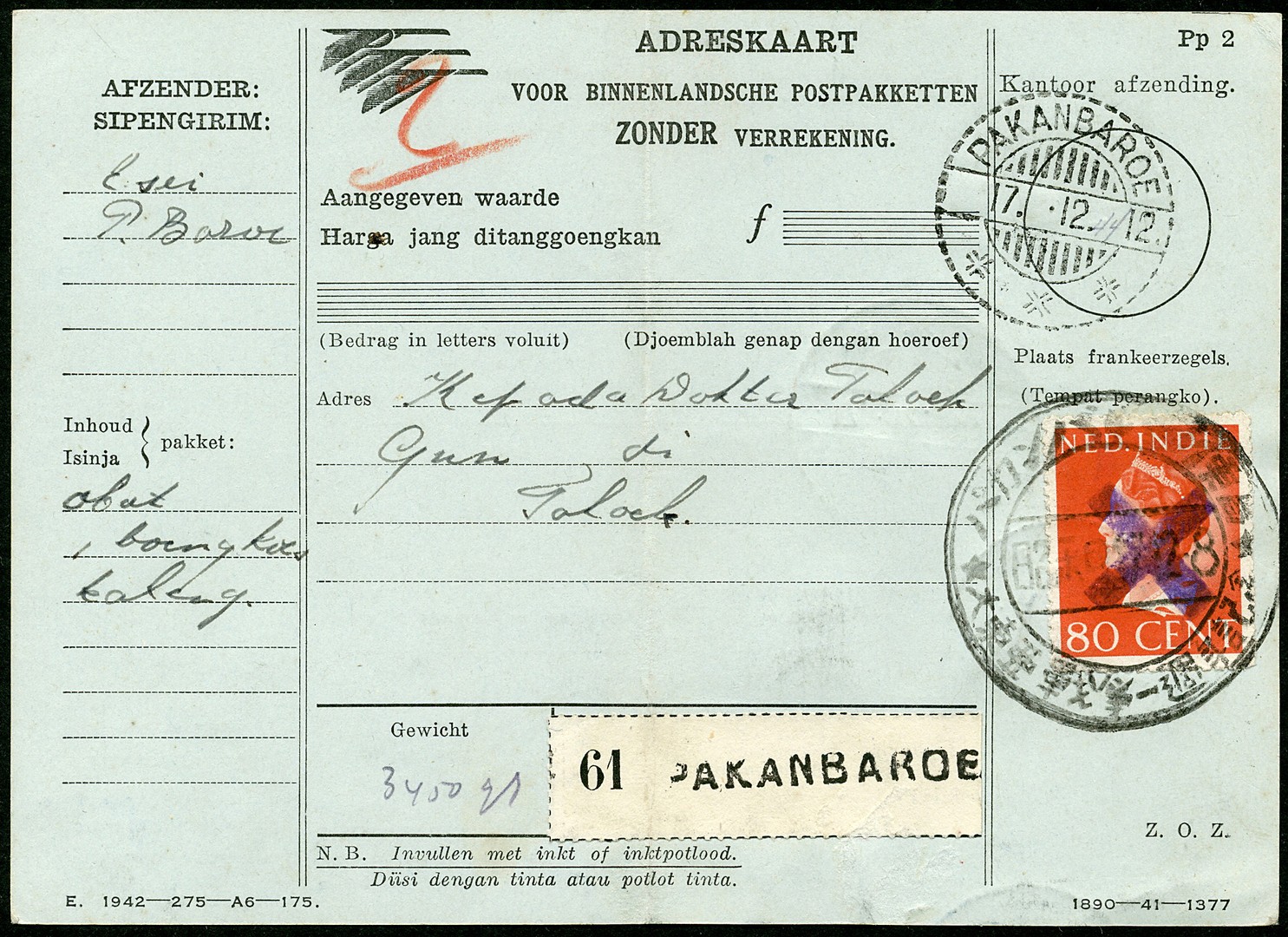 Sumatra. Riouw. Complete Parcel post address card Pp2 bearing 80c van Konijnenburg with Riouw cross overprint 371v-53k tied by commemorative pmk ´First Anniversary of the Great East Asia War´ type 412 from Pakanbaroe 17.12.12 to Taloek 17.12.15. Rare usage of the commemorative cachet
