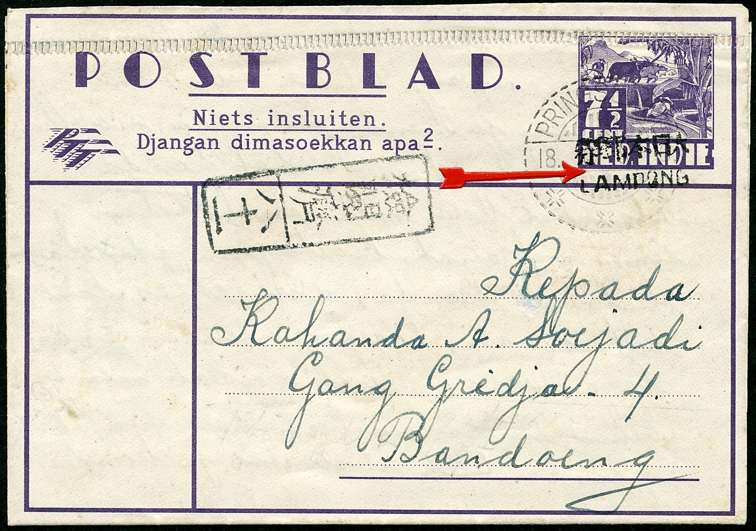 Sumatra. Lampong. 7½ Cent letter sheet with black Lampong overprint Bu.104 from the small sub-post office Pringsewoe 18.10.8 to Bandoeng, with sewing machine censor and censor mark type Bu.JC13c but from Palembang