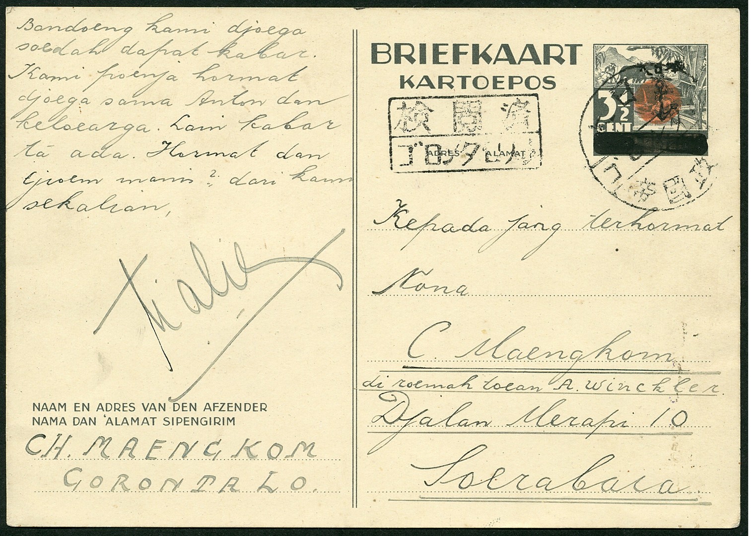 Celebes. North. 3½ Cent postcard with small orange disc and black North Celebes anchor overprints Bu.242b from Gorontalo (type 300) to Soerabaja. Written date is blackened. Censor Vr.212a from Gorontalo
