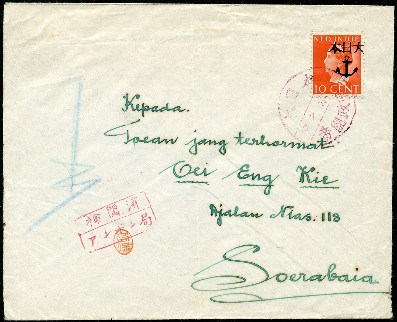 Moluccas. 10 Cent van Konijnenburg with black anchor overprint no. 531z-43II on cover cancelled Ambon in red (type 300) to Soerabaja. Censor Bu.JC3a in red from Ambon