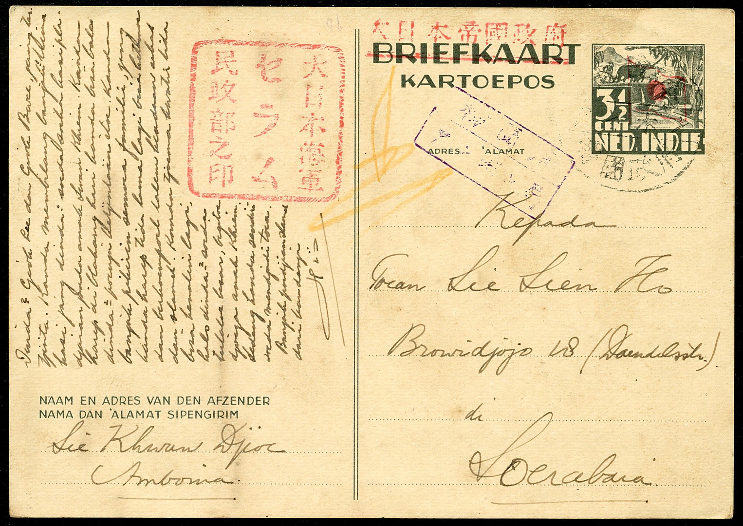 Moluccas. Ceram Postcard. 3½ Cent with red Ceram mark of 31x31 mm and flag overprint Bu.253b tied by black Teikoku Seifu pmk Amboina (vNV.300) to Soerabaja, probably from early 1943. Censor Bu.JC3a in violet from Amboina. A rare postcard (Bu. € 650)