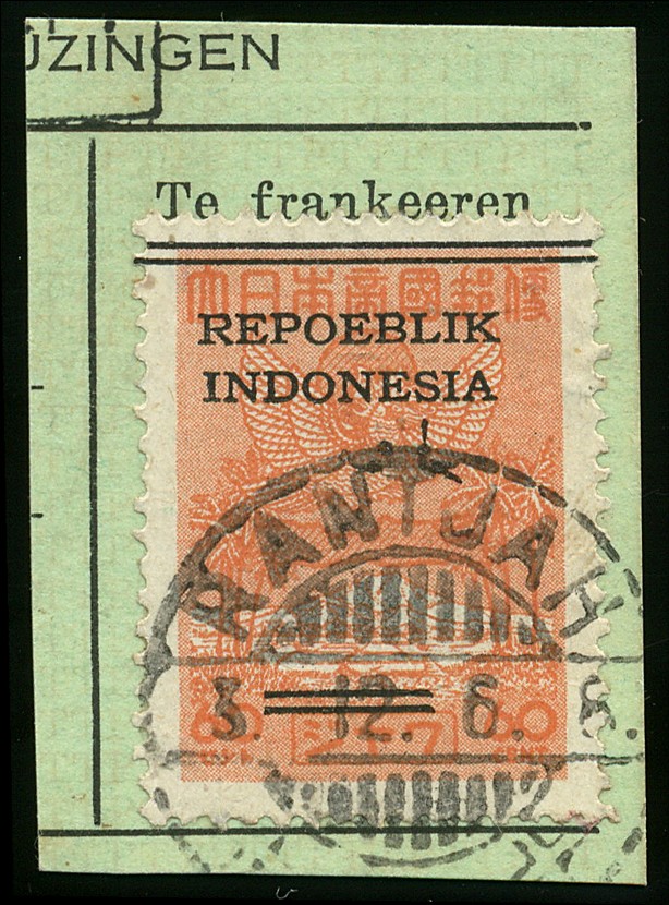 Java. 60c no. 015 on piece cancelled RANTJAH 3.12.6.8. Very rare pmk, sub-post office opened on 1 Oct 1944, only a few copies recorded (vNV.RR)