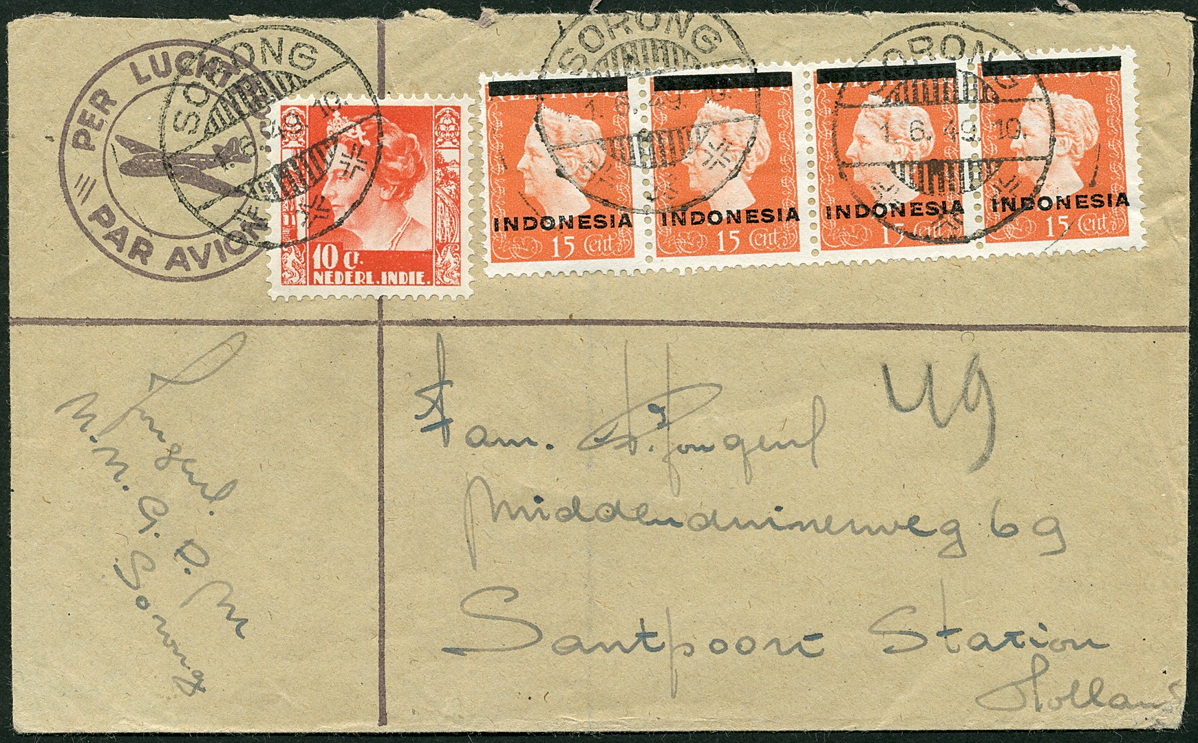 Luchtpostenvelop waarop aardige mengfrankering nrs. 253 en 351 in strip van vier van Sorong 1-6-1949 naar Nederland