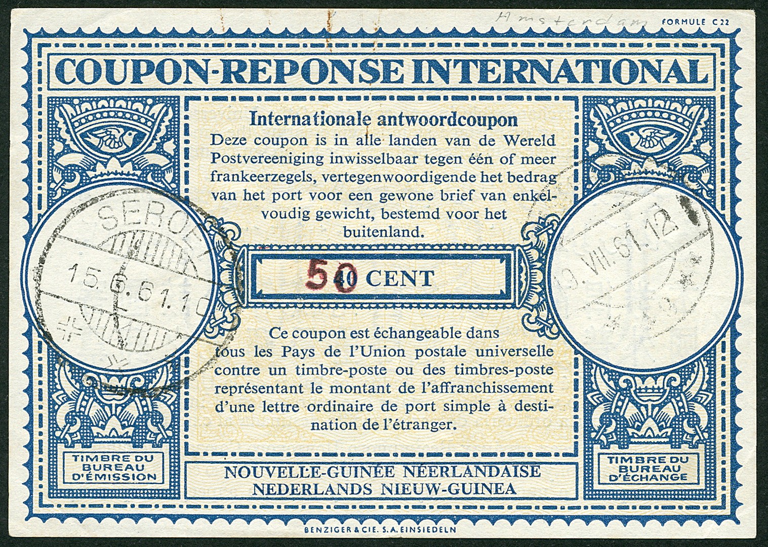 IAC, Model Londen, 15 stuks Ned. Nieuw-Guinea met afgiftestempels w.o. uit Kaimana 5-12-1958 en 29 stuks uit enkele andere landen met innamestempels in Ned. Nieuw-Guinea, w.o. van de Ned. Antillen (1962), Zweden (1958, 1962) en van Wenen naar bestelhuis MOETING waaronder ook in blauw datum 31 JULI 1958. Schaars materiaal!