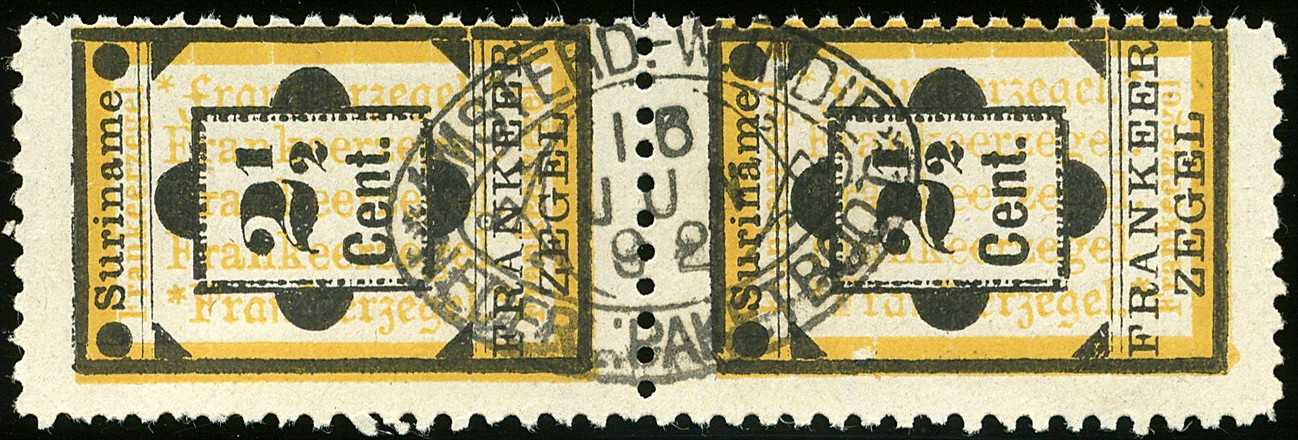 KWIM-ovaalstempel met datum 16-6-1892 op 2½c nr. 22. Verticaal prachtpaar met mooie, centrale afst.