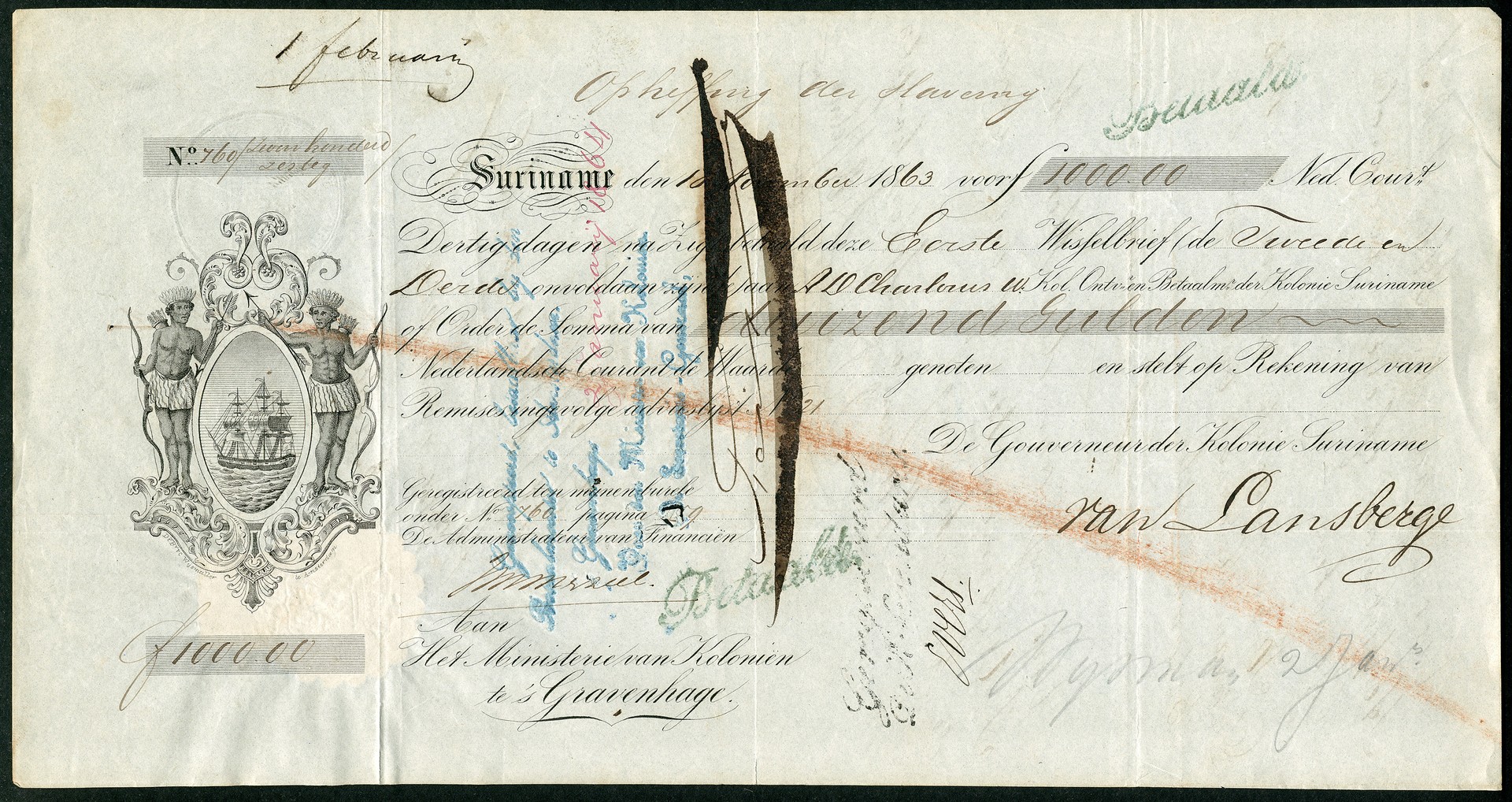 Wisselbrief voor het vergoeden van vrijgelaten slaven. De slavernij werd op 1 juli 1863 in Suriname afgeschaft en de slavenhouder werd daarvoor financieel schadeloos gesteld door de Nederlandse Staat. Deze wisselbrief nr. 760 is uitgeschreven op 10-11-1863, ondertekend door de Gouverneur der Kolonie Suriname R.F. van Lansberge, geldbedrag fl. 1000, uitgekeerd op 1-2-1864 aan toonder. Prachtig bewaard gebleven historisch document met notities, stempels en op de achterzijde een fiscaalzegel van 50 cent