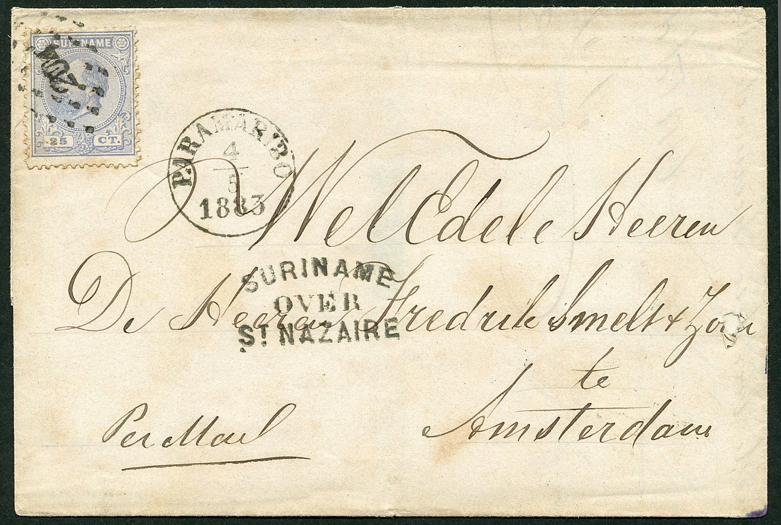 10 Cent nr. 10aC (prachtex.) afgest. met puntstempel 204 op briefhelft van Paramaribo 4-5-1883 over St.Nazaire naar Amsterdam 25-5. De afz. schrijft o.a. ´De communicatie is hier zoo ongelukkig mogelijk zonder eigen hulpmiddelen...´