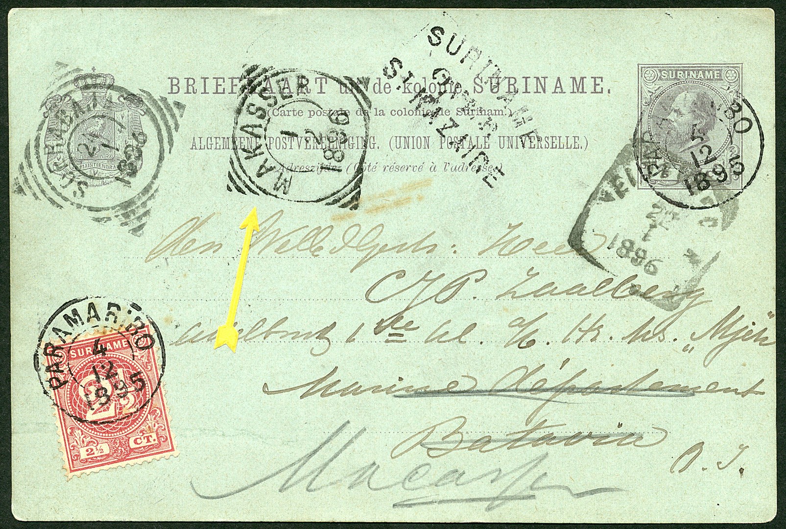 Bk. G9 bijgefr. met 2½c van Paramaribo 4-12-1895 over St. Nazaire, Weltevreden en Soerabaja naar Makasser 1-2-1896