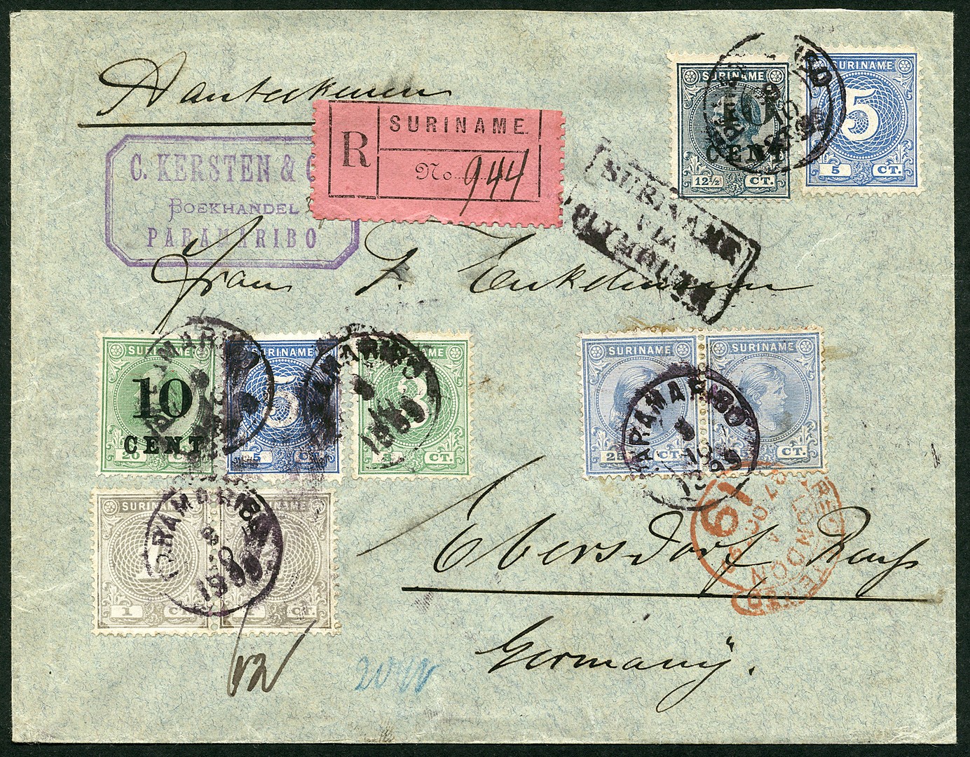 Weelderig gefr. env. van Kersten waarop 1c nr. 16 in paar, 3c nr. 19, 2x 5c nr. 20, 25c nr. 27 in paar, 10 cent op 12½c nr. 29 en 10 cent op 20c nr. 31, tezamen 85 cent op 9-10-1899 aangetekend via Plymouth en Londen 4-10 naar Ebersdorf 29-10