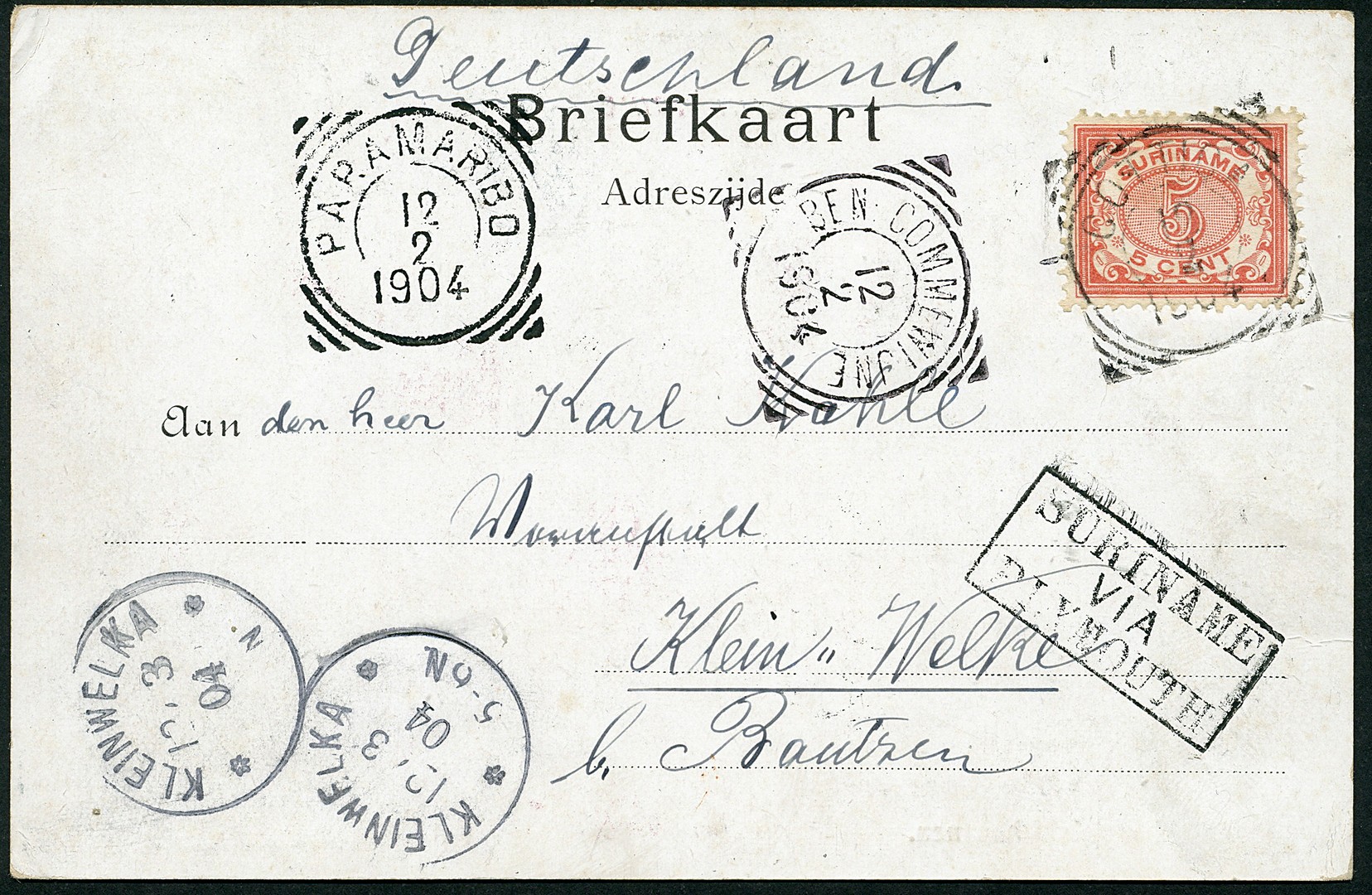 Prentbk. (´Meid met bos bananen´) gefr. met 5c (mist hoektandje) met de rivierbootdiensten Cottica 12-2-1904 (5 dagen vroeger dan vermelde periode, ES. blz. 102) en Ben. Commewijne 12-2 over Paramaribo 12-2 via Plymouth naar Kleinwelka (D) 12-3