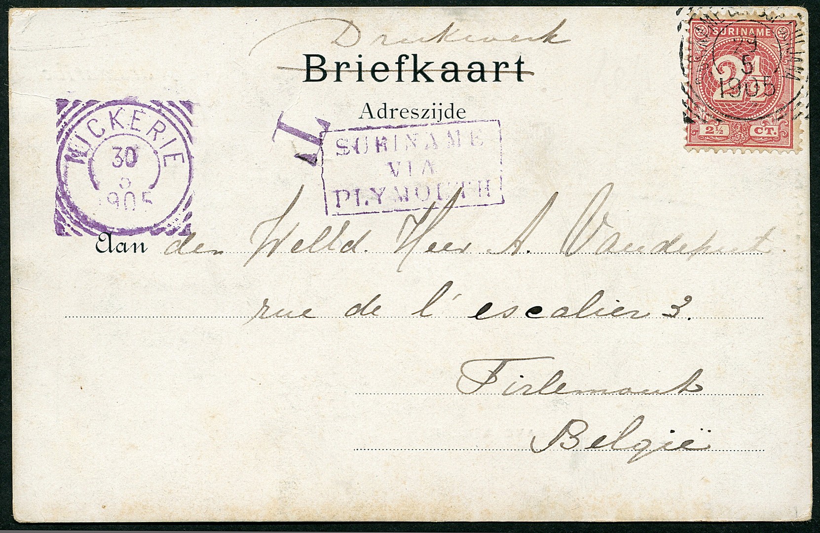 SURINAME-BRITSCH-GUIJANA op 2½c op ontoereikend gefr. prentbk. op 29-5-1905 over Nickerie 30-5 via Plymouth (violet routestempel te Nickerie geplaatst) naar België