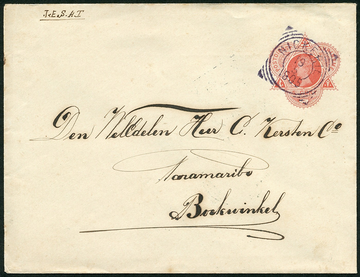 Vierkant FERRIJ DIENST 9-11-1907 op env. G1 naar de Plantage Meerzorg, en vierkant NICKERIE 19-5-1905 in blauw op G1 naar de boekwinkel van Kersten 20-5