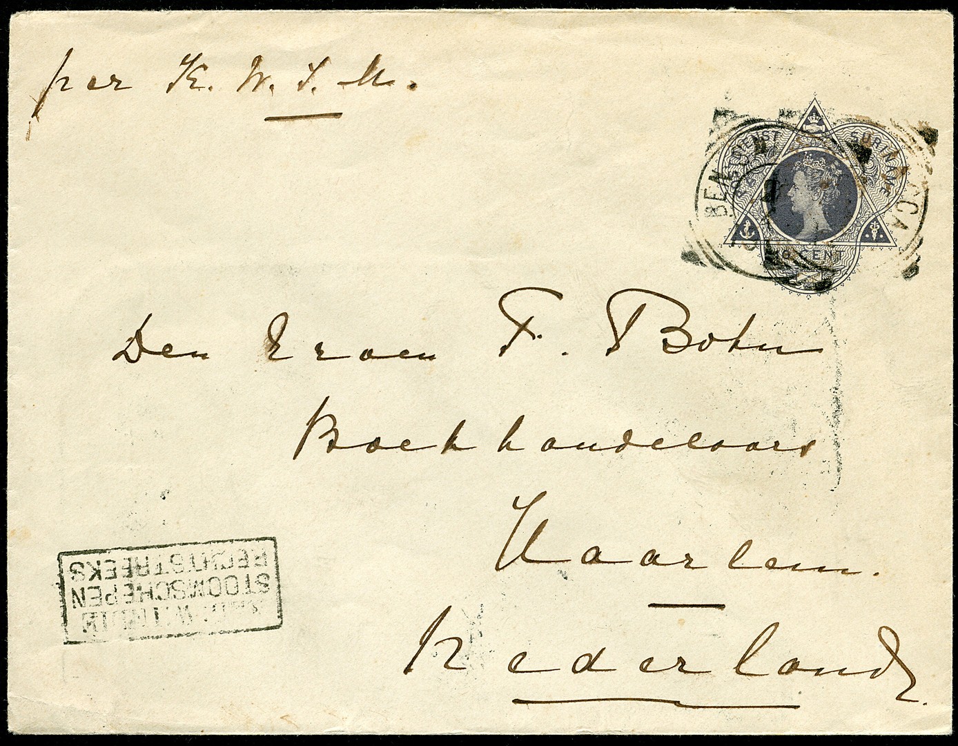 Vierkant BEN: SARAMACCA 28-4-1906 over Paramaribo 28-4 naar Haarlem 27-5. Slechts weinig poststukken bekend