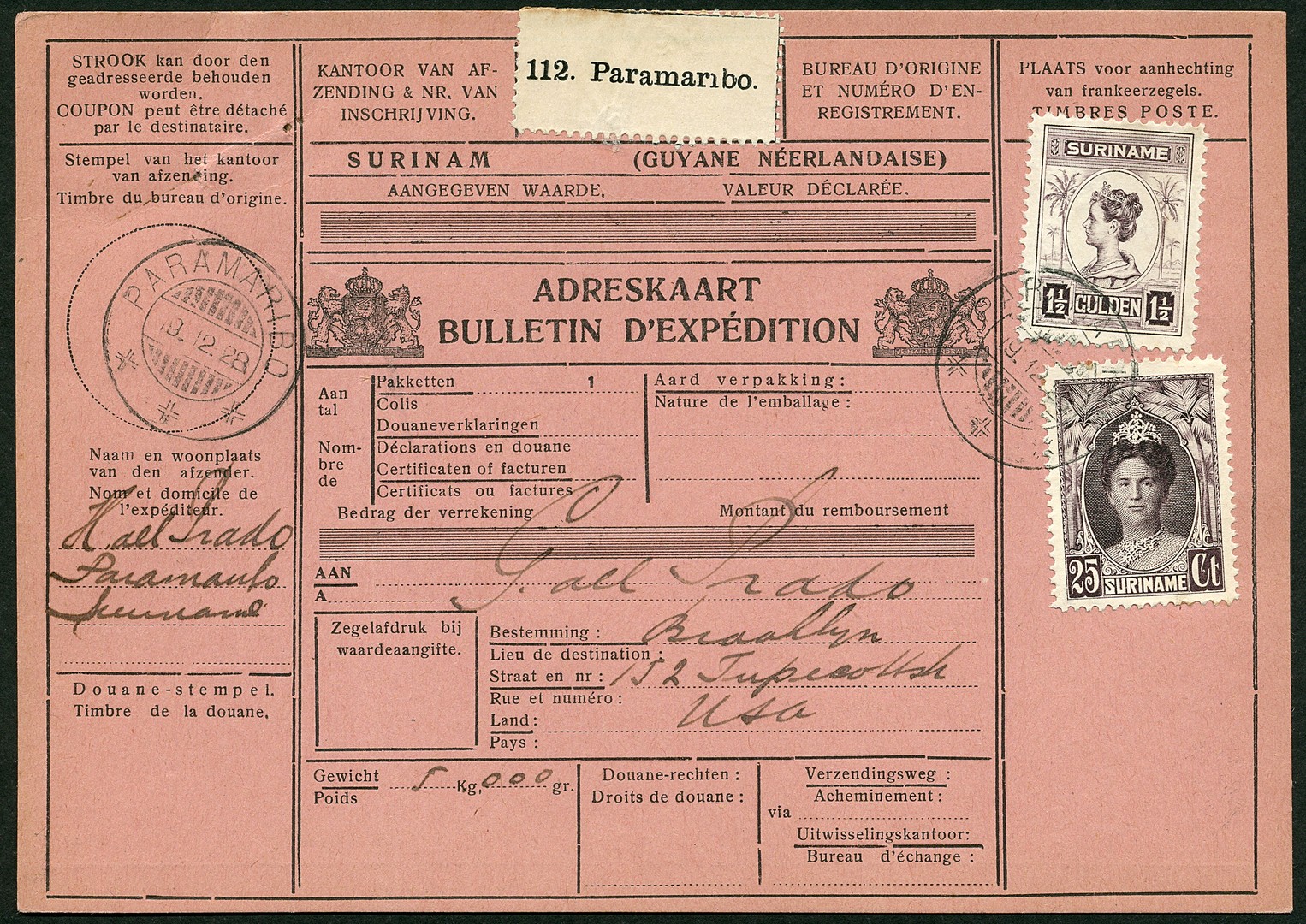 Twee adreskaarten incl. coupon beide voor een pakket van 5 kg. naar de USA gefr. met 1½ gld nr. 102 en 25c nr. 124 van 19-12-1928 resp. gefr. met 50c, 1 gld en 25c nrs. 100, 101 en 124 van 19-11-1929. Kaarten ES. type 6a