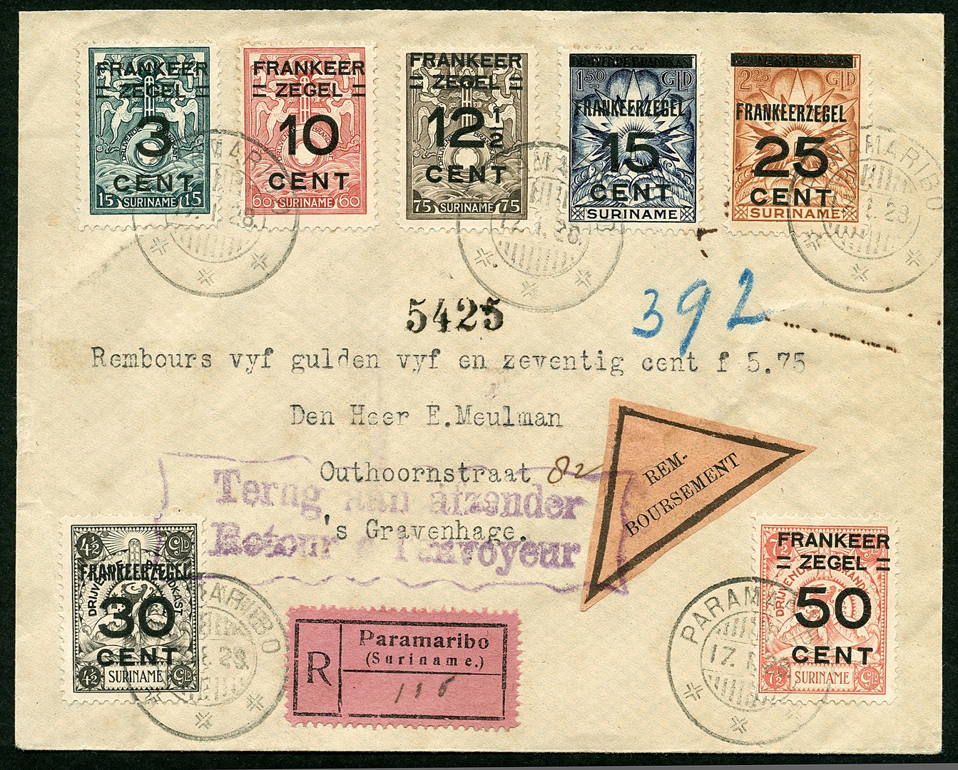 Rembours. Serie tot frankeerzegel overdrukte niet uitgegeven brandkastzegels nrs. 130/36 als aangetekende remboursbrief van fl. 5,75 verz. van Paramaribo 17-1-1928 naar ´sGravenhage 8-2-1929, geretourneerd omdat het stuk niet is afgehaald. Een remboursbrief van Suriname is buitengemeen schaars, slechts vijf bekend waarvan vier op 17-1-1928 naar ´sGravenhage. Zie ES. deel II blz. 192