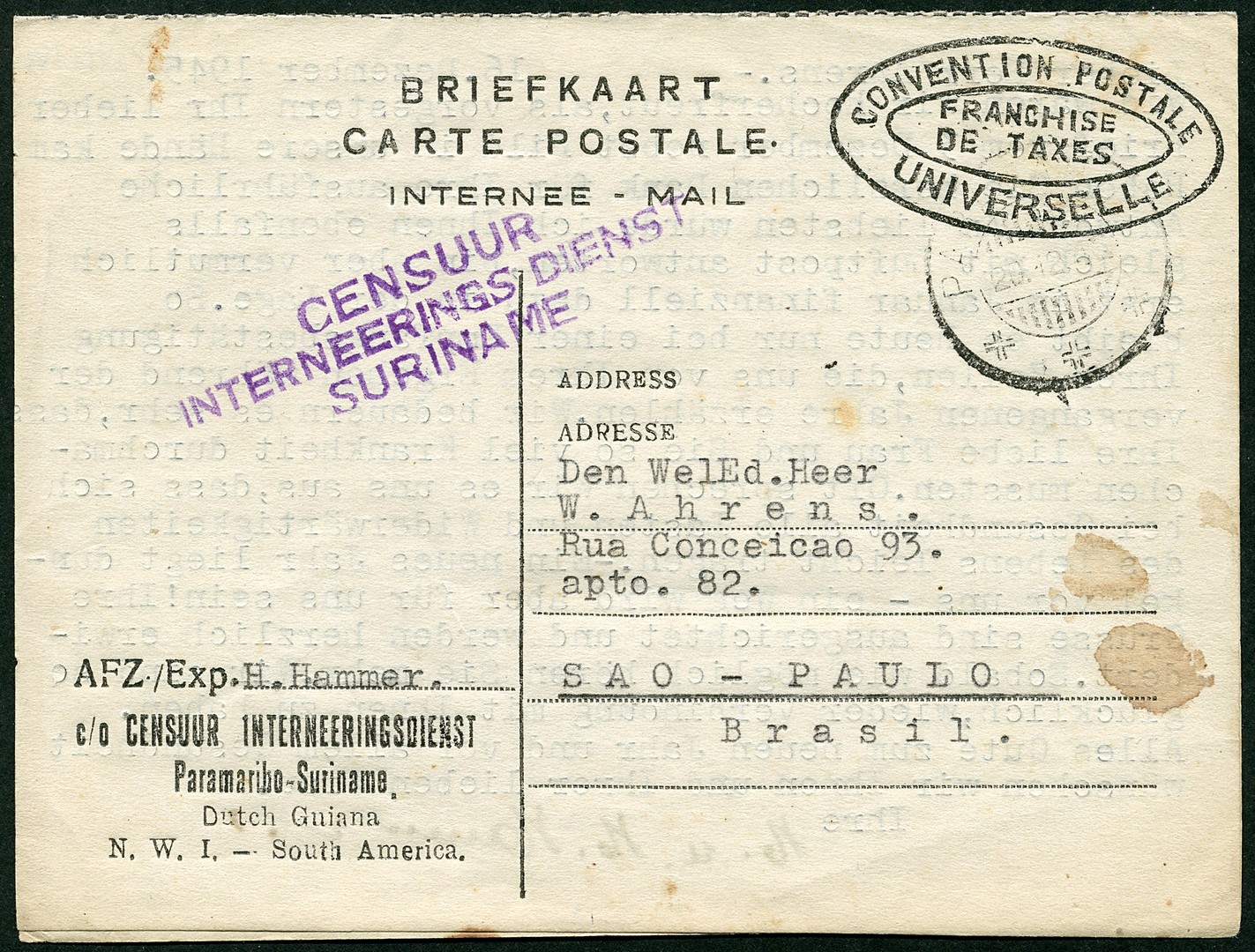 Interneringspost. Dubbele interneringskaart door een Duitse gevangene op 20-12-1945 verz. naar Sao Paulo in Brazilië (schaarse bestemming!). ES. type 2 (zie: deel I, p.246)
