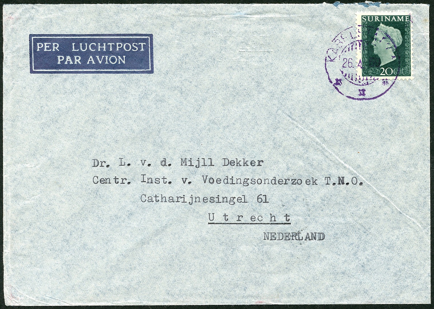 Luchtpostenv. (afz. ziekenhuis te Kabel) gefr. met 20c in violet afgest. met het gezochte kortebalkstempel KABELSTATION 26-4-1959 naar Utrecht. Zeldzaam!