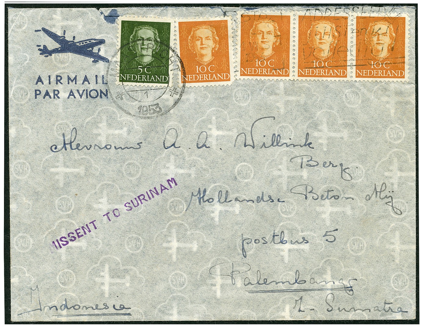 Missent to Surinam. Vijf poststukken per abuis verzonden naar Suriname waarop stempels ES. type 3a (1953 violet), 3c (1961 violet, 1964 zwart) en twee andere typen uit 1987 (violet) en 1993 (blauw)