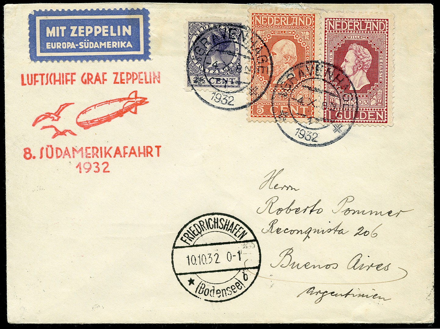 Zeppelinpost. 8e Vaart naar Zuid-Amerika in 1932 op 10-10. Mooi couvert met o.a. Jub. ´13 naar Buenos Aires, VH.I.68b. Tevens couvert met 7e Vaart in 1935, VH.I.103a. € 125+90