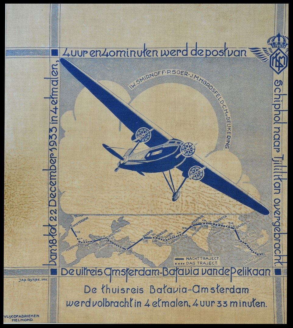 Een BATIK bedrukte herdenkingsdoek ter gelegenheid van de vlucht van het vliegtuig 'de Pelikaan' van Amsterdam naar Batavia december 1933, bedrukt in blauw met de afbeelding van het vliegtuig en de route (het nacht- en dag-traject) die het aflegde van Amsterdam naar Batavia. Om de buitenrand de doorlopende tekst "de uitreis Amsterdam-Batavia van de Pelikaan. Van 18 tot 22 December 1933 in 4 etmalen, 4 uur en 40 minuten werd de post van Schiphol naar Tjililitan overgebracht. Boven het vliegtuig de namen van de bemanning, I.W. Smirnoff, P. Soer, J.M. Grosfeld en C.H. v. Beukering, rechtsboven het KLM-logo ontwerp Jack Rijkse, uitvoering Vliscofabrieken Helmond (P.F. van Vlissingen & Co.), afmeting 38 x 38