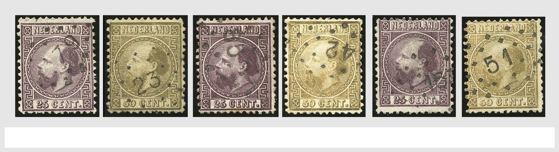 Puntstempels op emissie 1876, kleine verzameling waarbij div. aardige ex. o.a. nr.14 (op nr.8), 66 zonder punt (nr.7), 79 (nr.12), 85 (nr.11), etc. Hoge stempel- en cataloguswaarde!
