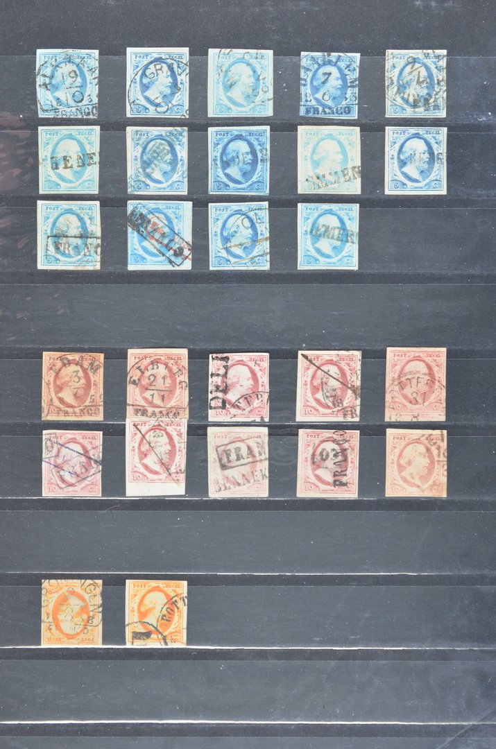 Emissie 1852, 5c (14x), 10c (10x), 15c (2x) met diverse stempels w.o. naamstempels, Na Posttijd in rood waar overheen Franco, Groningen C3, brief met 5c in prima gerand randpaar van Zevenbergen 20-3-1863 naar Antwerpen en omslag met 10c met Groningen B 10-5-1854 naar Ankum (D)