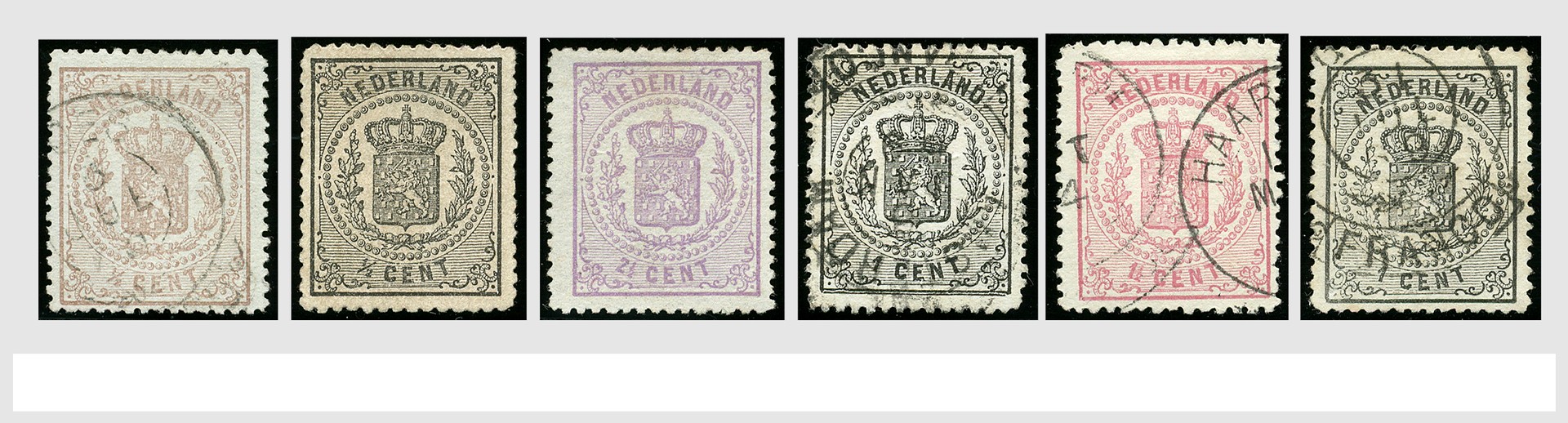 Emissie 1869, verz. met tandingen en variëteiten op albumbladen, bevat o.a. 13A met cert., 14Afa, 18A zonder gom