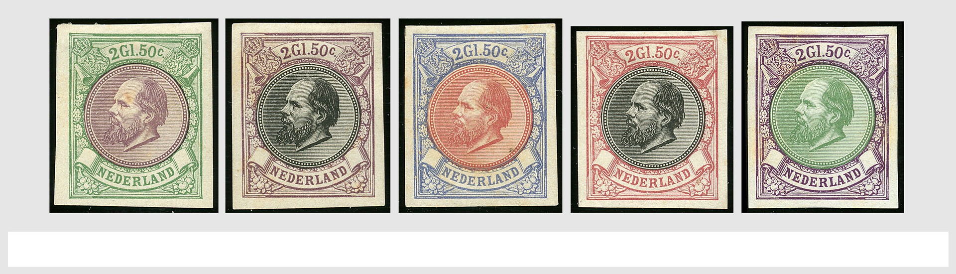 Emissie 1872, Berlijnse kleurproeven PC83 t/m PC88 compleet (35 stuks) en PC89, 12 stuks in div. kleuren, alle prachtex.. Cat.wrd. Hfl.2550