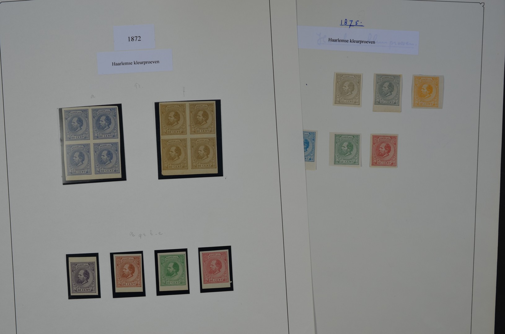 Emissie 1872, Haarlemse kleurproeven PC92a, (blok van vier), b, c, d, e en f (blok van vier) en PC93, 7 stuks in div. kleuren wb. gekozen kleur Hfl.1680