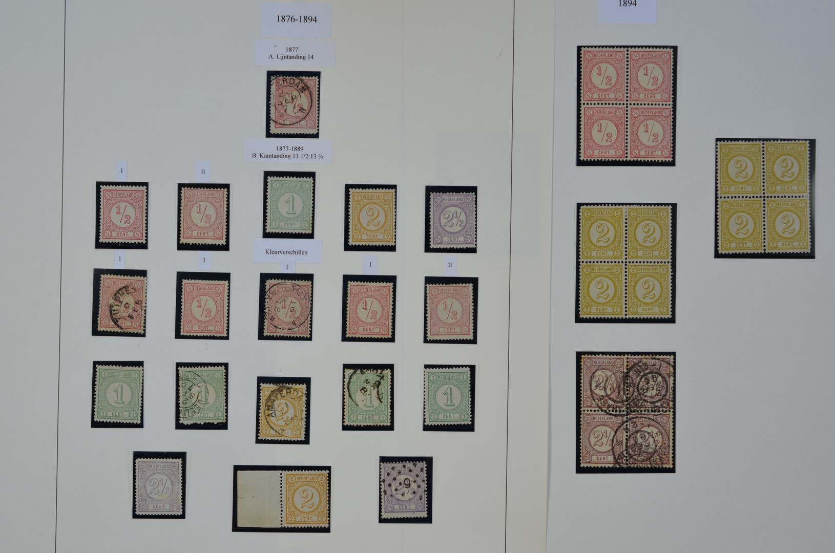 Emissie 1876 en 1894, o/* op typen, tandingen en kleuren verzameld op albumbladen, met o.a. 30AI, blokken van 4, combinaties, 'Bossche tandingen', veel plaatfouten, etc.