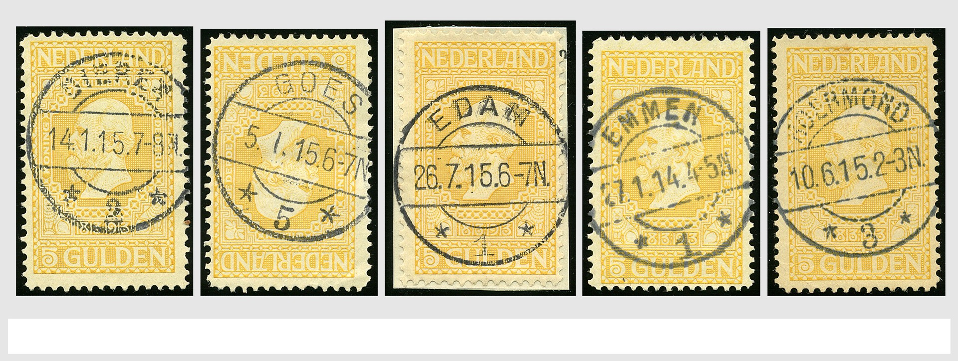 Jubileum 1913, 5 Gulden nr. 100, 25 ex. los of op knipsel, alle mooi afgestempeld. € 1125