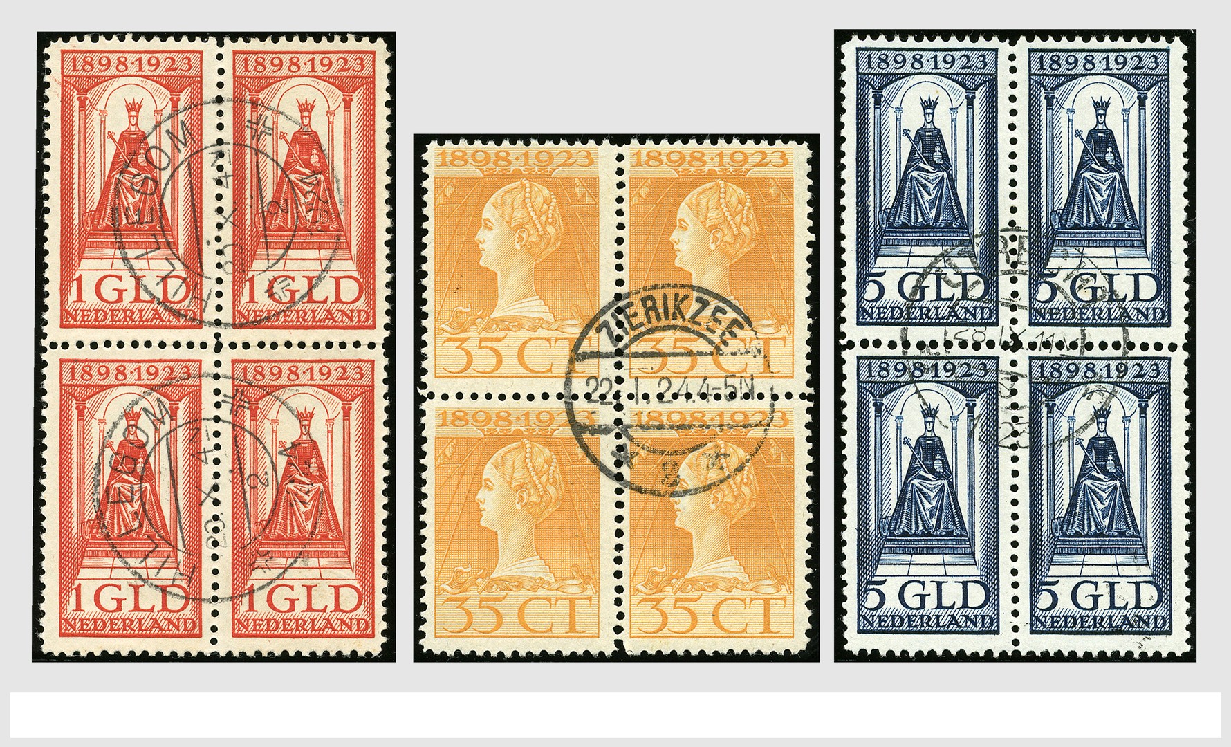 Jubileum 1923, diverse waarden in meerdere gebruikte strippen of blokken van vier, w.o. 5 gulden
