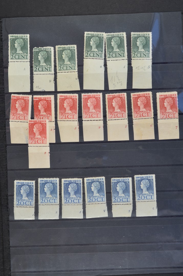 Jubileum 1923, plaatnummers op de 2 cent* (1, 3, 4 van fraai ex., 5, 8, 9), 7½ cent* (1-8) en 20 cent* (1-6)