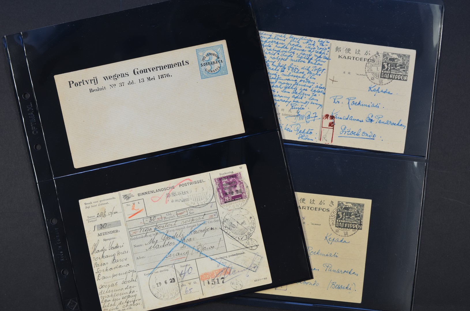 POSTHISTORIE, 3 oude buitenlandse kwitanties in Nederland uitbetaald, 1 landbouwcongresenvelop, 5 poststukken Jap. bezetting