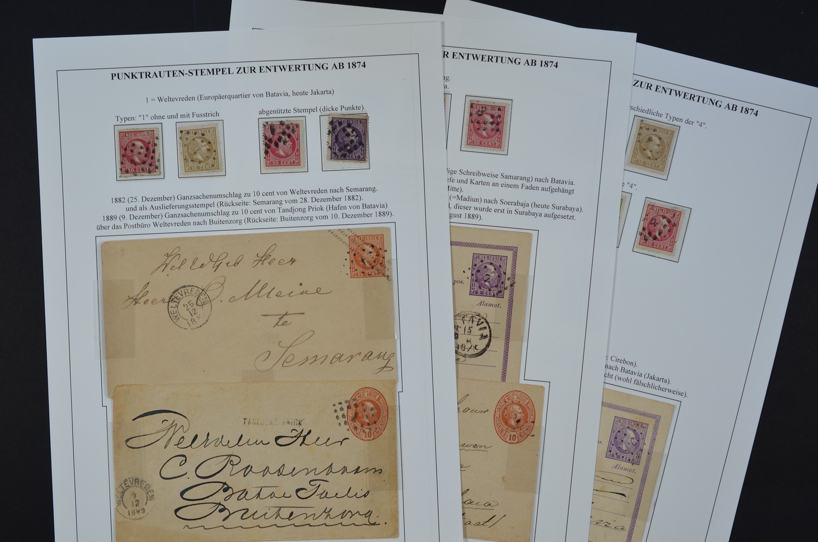 NED.- INDIË POSTHISTORIE, bescheiden verzameling punt-, rond- en kleinrondstempels op losse zegels en 30 poststukken, netjes opgezet en beschreven op bladen
